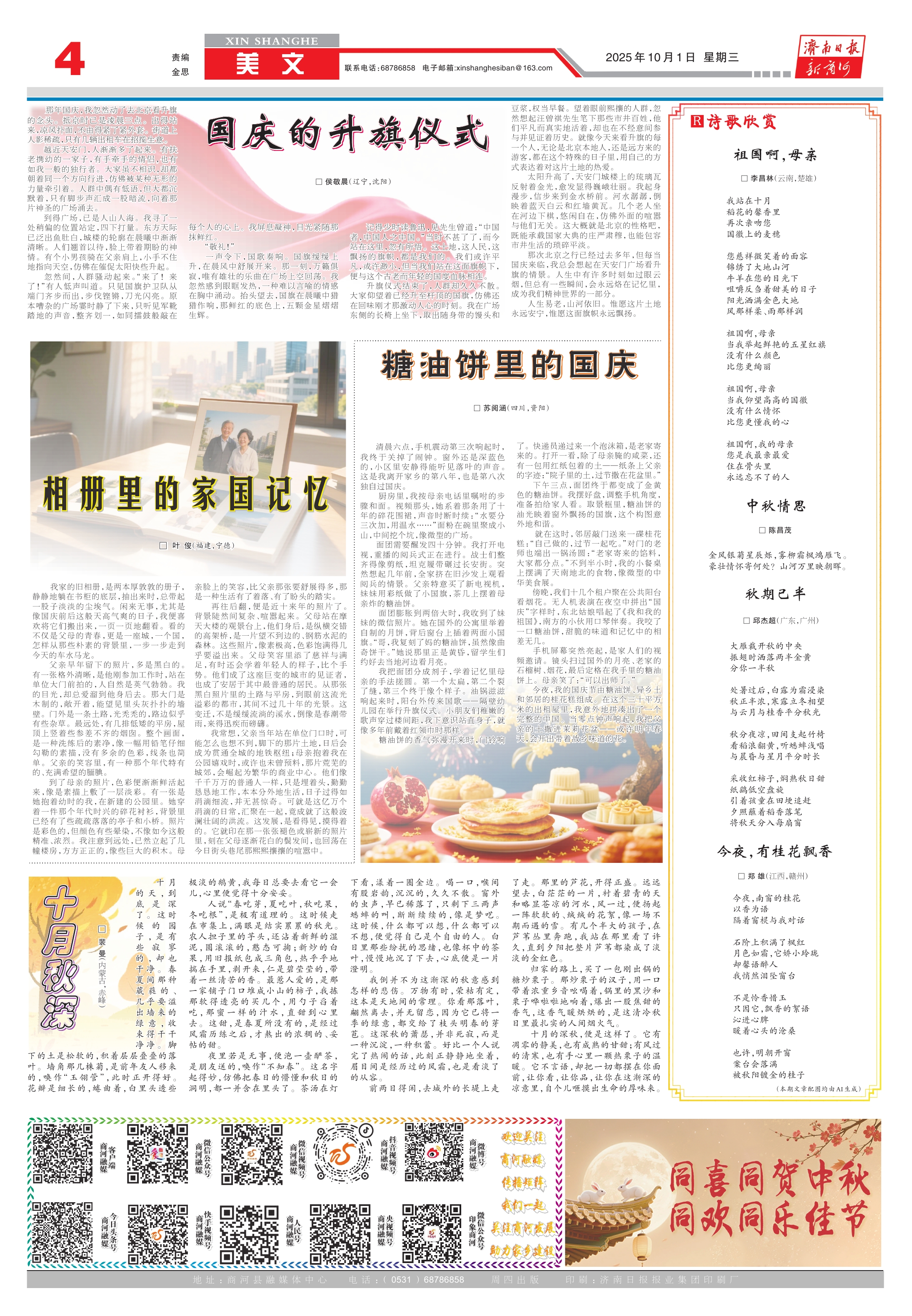 今夜,我的国庆节由糖油饼、异乡土和邻居的桂花糕组成。在这个三十平方米的出租屋里,我意外地拼凑出了一个完整的中国。当零点钟声响起,我把父亲的土撒进茉莉花盆——或许明年春天,会开出带着故乡味道的花。